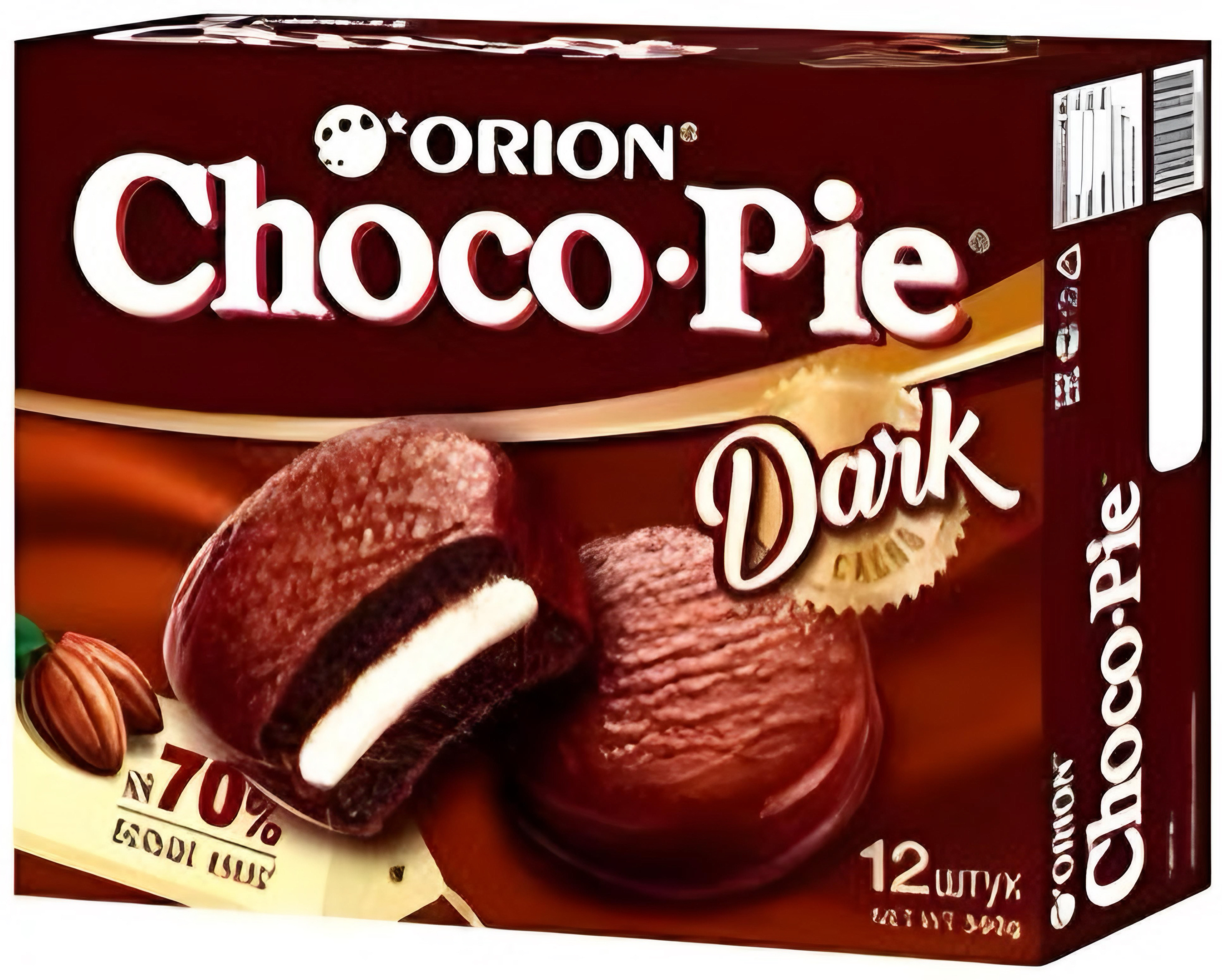 Orion Choco Pie Dark – pokračující úspěch Orion Choco Pie Original nás inspiroval k vývoji nových receptur, z nichž jeden je Choco Pie Dark. Vzali jsme kakaové boby a náš tradiční recept, vložili jsme do toho své srdce a duši a vytvořili nový Choco Pie v tmavém formátu, ve kterém o 70 % více kakaa.