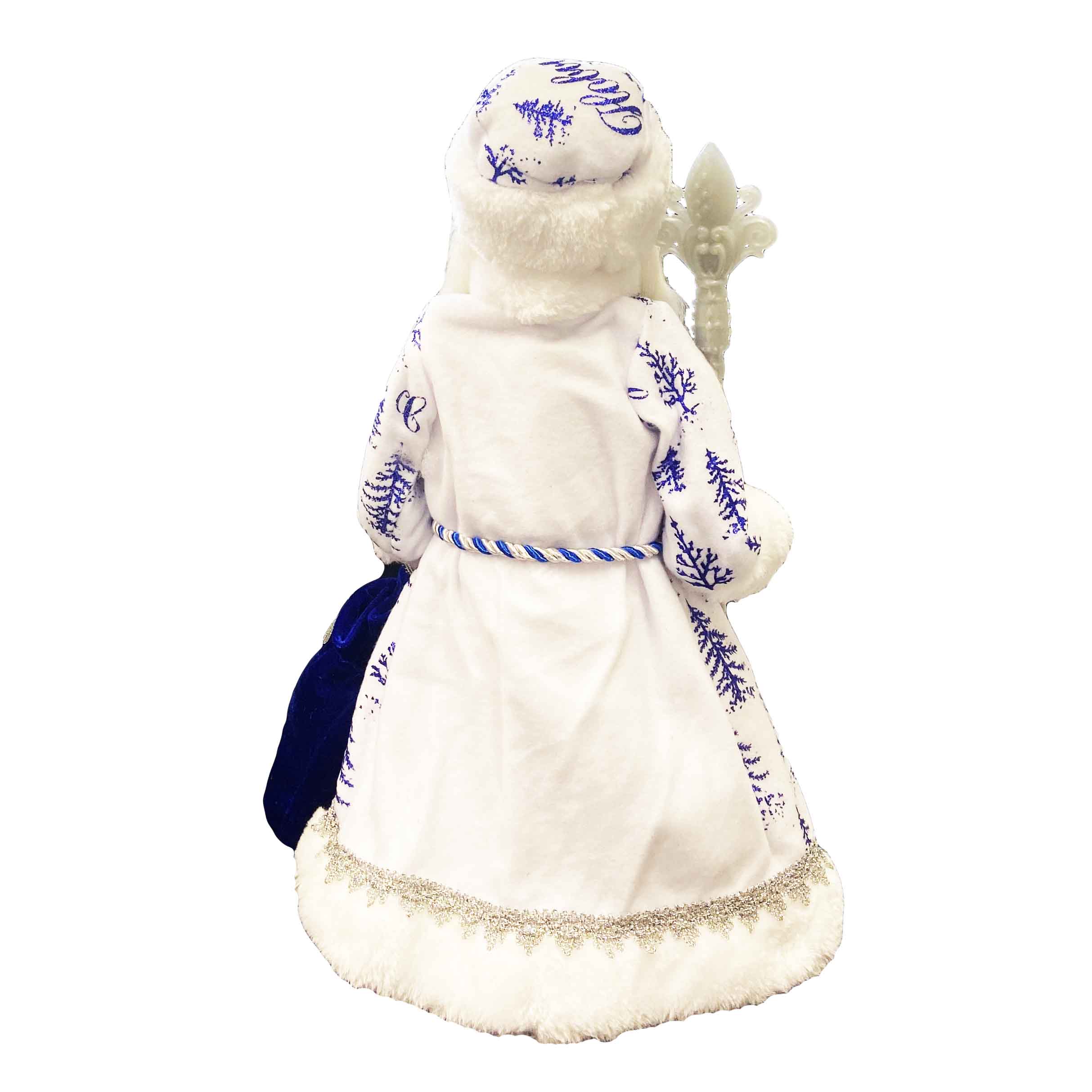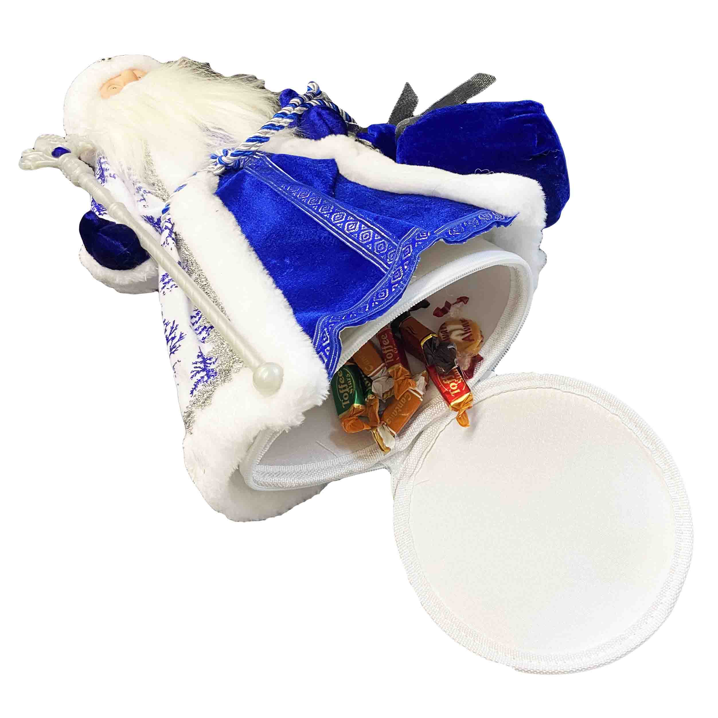 Figurka Děda Mráze v modro-bílé se stříbrem, s oddělením na cukrovinky a dárky, 40 cm