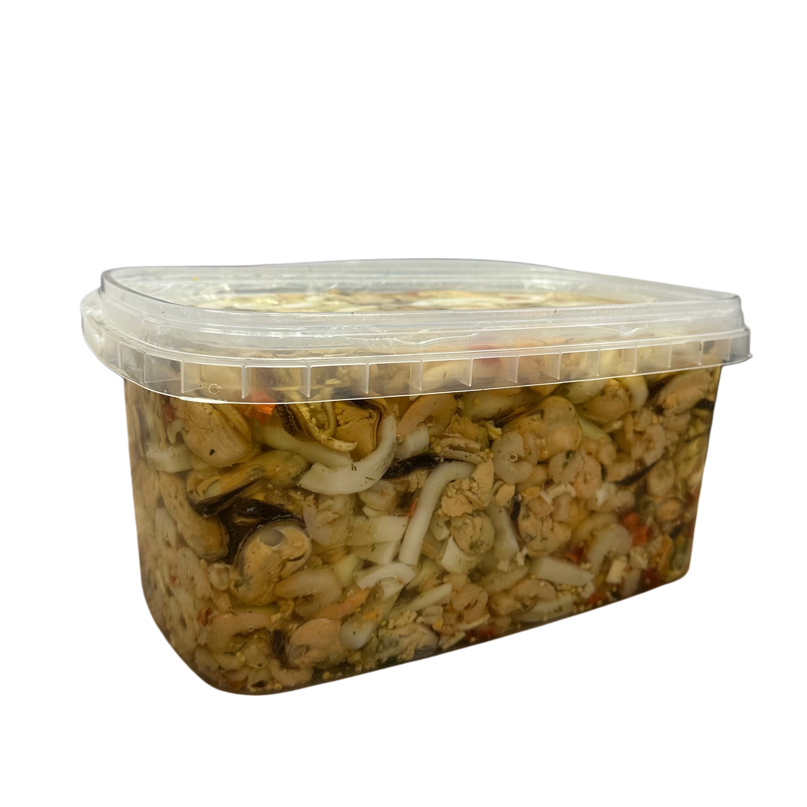 Složení: krevety, kalamáry, mušle, lihový ocet, sůl, cukr, bobkový list, černý pepř; olejový nálev 20 % (řepkový olej 28 %, lihový ocet, sůl, cukr, bobkový list, černý pepř, konzervanty: benzoan sodný, glutamát sodný); sušená zelenina 2 % (sladká paprika, mrkev, pastinák, cibule, pór).