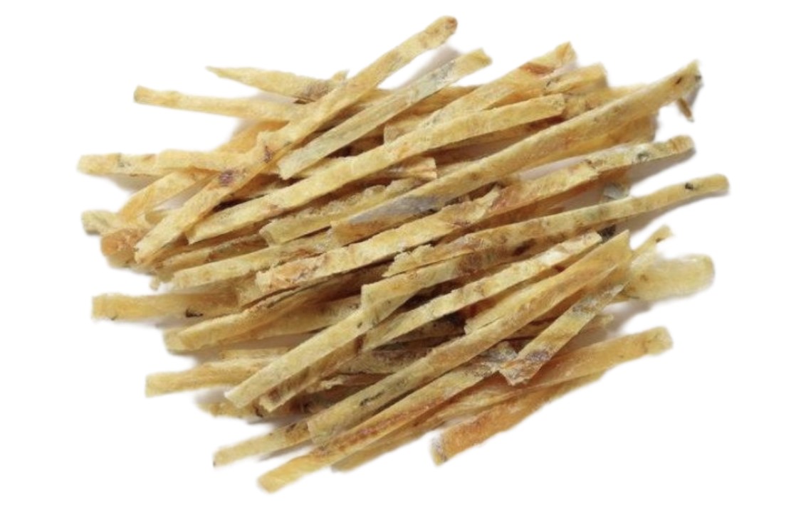 Složení: Treska (gadus macrocephalus) 83%, sůl, (8% zvýrazňovač chuti a vůně, glutaman sodný E621, konzervant E420.